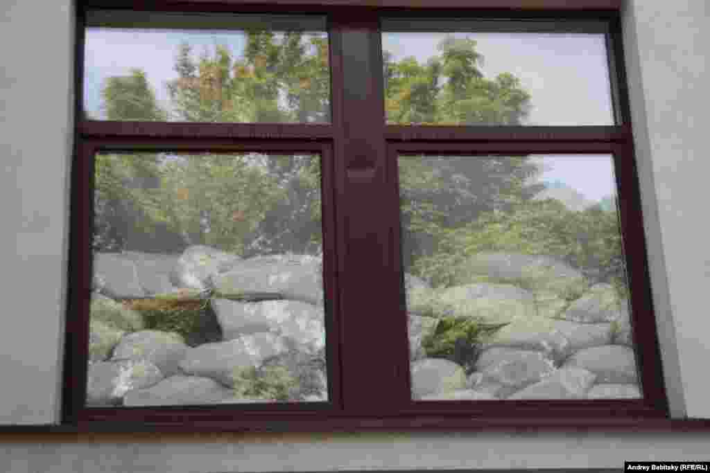 Луганск облысы әкімдігі ғимаратының алдындағы тас жолға фотографиялар мен гүл шоқтары қойылған.
