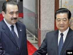 Кәрім Мәсімов (сол жақта), Қазақстан премьер-министрі Қытай төрағасы Ху Цзиньтаомен кездесіп тұр. Шанхай, 30 сәуір 2010 жыл