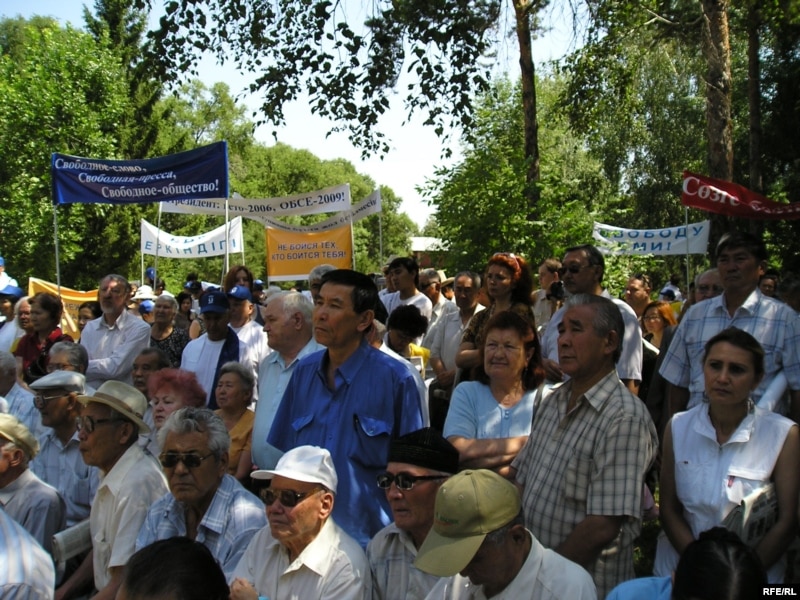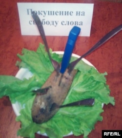"Азат" партиясының белсенділері әзірлеген "Сөз бостандығына шабуыл" атты ас. Талдықорған, тамыз 2009 ж