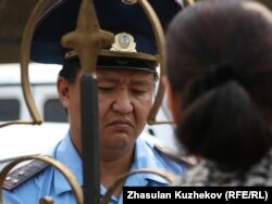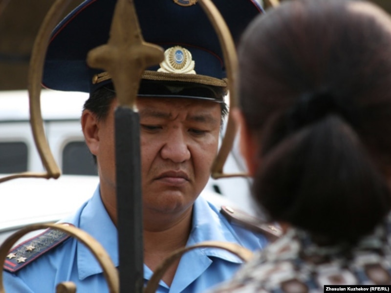 Қылмыстық-атқару жүйесі комитетінің қақпасы алдында полиция қызметкері мекемеге келгендердің бірімен сөйлесіп тұр. Астана, 14 тамыз 2010 жыл.