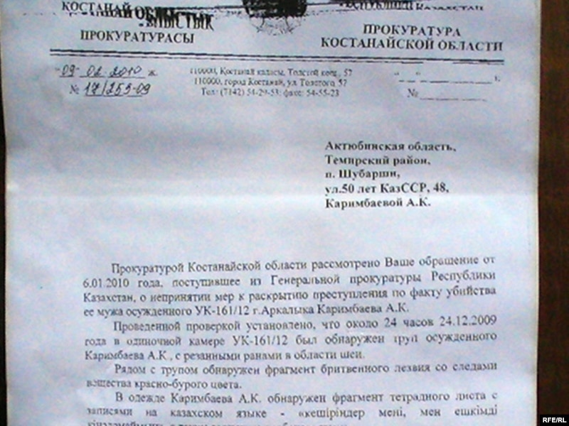Азамат Кәрімбаевтың өліміне қатысты Қостанай облыстық прокуратурасының Айманға берген ресми жауабы. ақпан, 2010 жыл