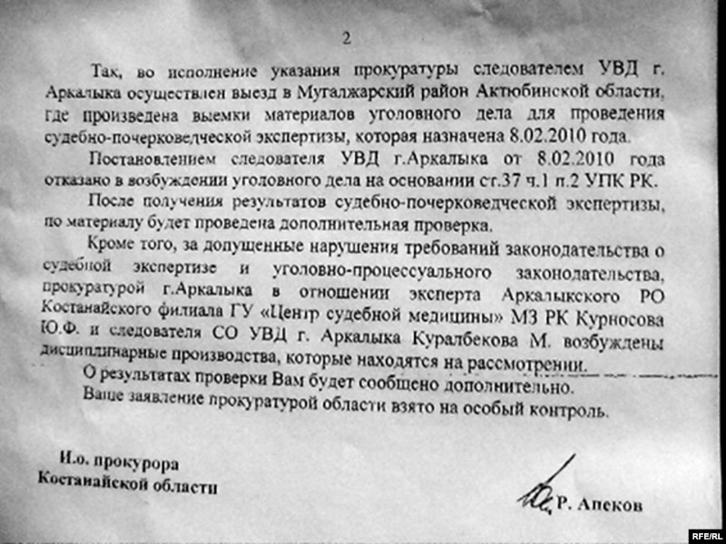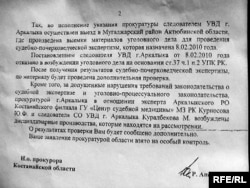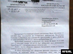 Азаматтың өліміне қатысты Айманның арызына Қостанай облыстық прокуратурасынан келген жауап. ақпан, 2010 жыл.
