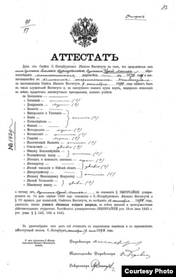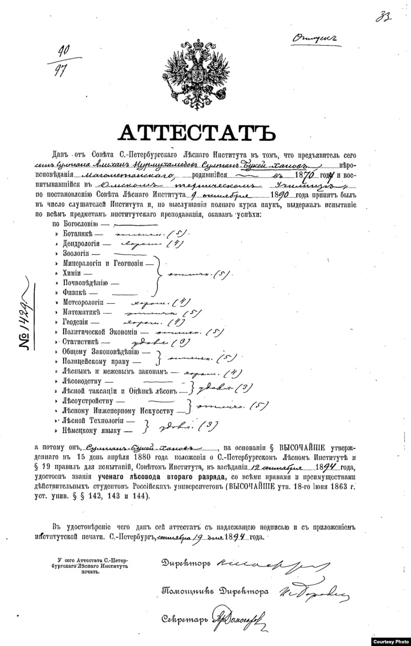 Әлихан Нұрмұхамедұлы Бөкейханның Петербордағы Императорлық орман институтын 1894 жылы тәмамдағаны туралы аттестат (диплом). Петербордың мемлекеттік тарихи мұражайы. Қыркүйек, 2009 жыл.