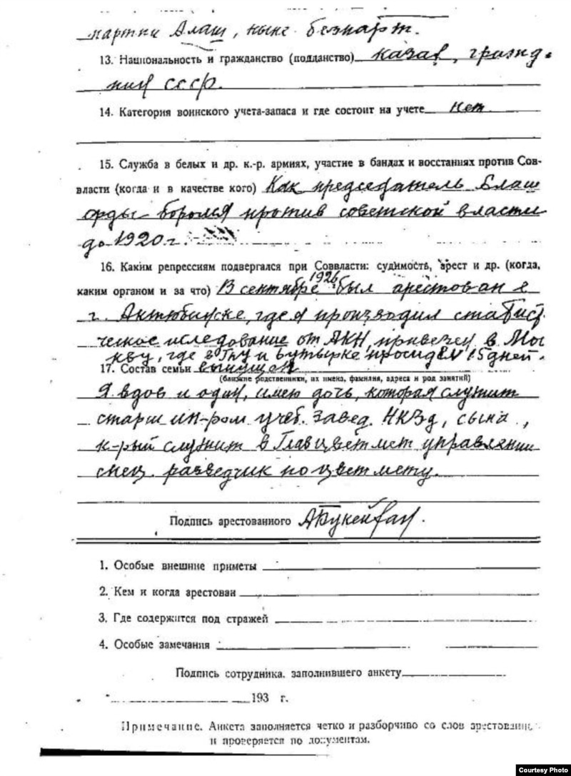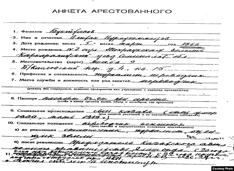 Әлихан Нұрмұхамедұлы Бөкейхан 1937 жылы шілде айында тұтқындалған кезде өз қолымен толтырған анкета. Ресей ФСБ-ның мұрағатындағы құжат. Мәскеу, ақпан, 1995 жыл.