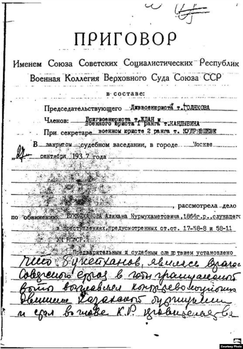 «Советше әділетті соттаудың» сол актісіне үңілсек, бір нәрсені байқау қиын емес – Мәскеуде өткен жабық сот мәжілісінде төрағалық етуші «Дивизиялық әскери заңгер Голиков жолдастың, сот мүшелері: Бригадалық әскери заңгер Ждан жолдастың және 1-інші дәрежелі Әскери заңгер Кандыбин жолдастың, және де хатшы,