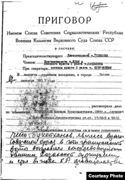 Әлихан Нұрмұхамедұлы Бөкейханды ату жазасына кесу туралы ССРО Жоғары Соты Әскери алқасының 1937 жылы қыркүйектің 27-сі күні шығарған үкімінің көшірмесі. Сот үкімі сол күні орындалған. Ресей ФСБ-ның мұрағатындағы құжат. Мәскеу, ақпан, 1995 ж.
