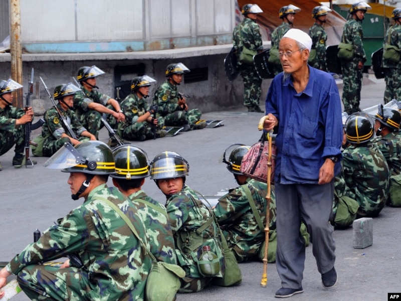 Қытай әскері демалып отырған көше бойымен келе жатқан мұсылман қариясы. Үрімжі, 8 шілде 2009 ж.