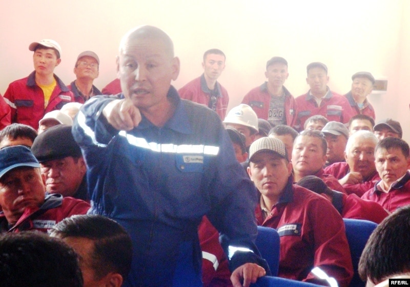 «Жылыоймұнайгаз» басқармасының жұмысшысы Қонысбай Оразов (ортада) кәсіпорында тамыр-таныстықтың етек алғанына наразылық ретінде аштық жариялайтынын мәлімдеді. Прорва кеніші, Атырау облысы, 18 сәуір 2010 жыл.