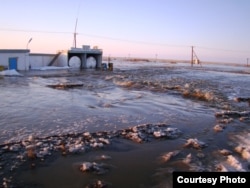 Тасқын су Көкжыра ауылына кіретін жолдың үстін тұтас алып кетті. Тарбағатай ауданы, Шығыс Қазақстан облысы. 20 наурыз 2010 жыл. Ауыл тұрғындары түсірген сурет.