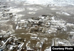 Қызылсу басқан Көкжыра ауылының биіктен көрінісі. Тарбағатай ауданы, Шығыс Қазақстан облысы. 20 наурыз 2010 жыл. Облыстық төтенше жағдайлар қызметінің суреті.