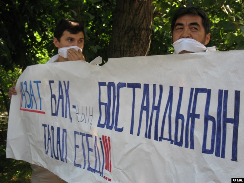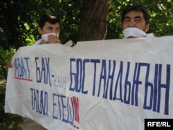 Сөз бостандығын қорғап наразылық акциясын өткізушілер биліктен баспасөз құралдарына қысым жасауды тоқтатуды талап еткен жазулар ұстап шықты. Алматы, 24 маусым, 2009 жыл.