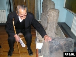 Этнограф Жағда Бабалық бетінде домбыра және билеп тұрған адамдар бейнеленген тарихи тасты алғаш тауып, 1988 жылы мұражайға тапсырған. Алматы, 8 қазан 2008 жыл.
