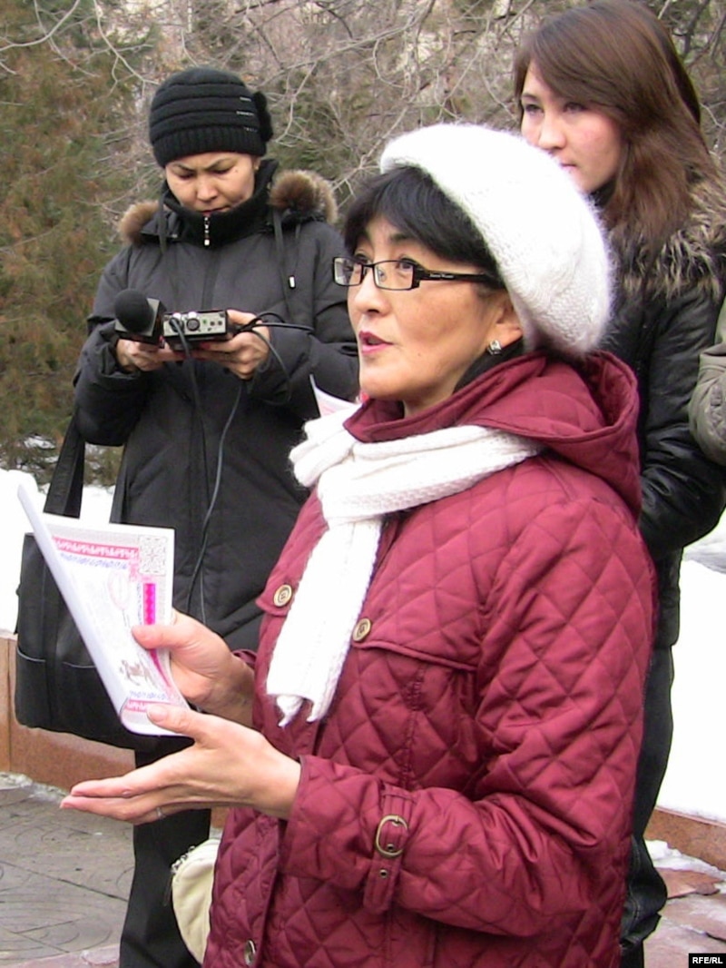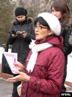 «Ар.Ру.Хақ» қоғамдық ұйымының жетекшісі Бақытжжан Төреғожина ГУЛАГ-тың жабылғанына 50 жыл толуына арналған акцияда өлең оқып тұр. Алматы, 25 қаңтар 2010 жыл.