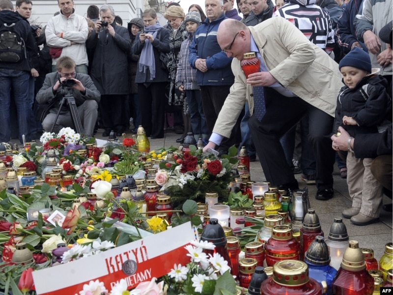 Ресейдің «Россия-24» телеарнасы Катынь ескерткіші жанында қолдарына Польшаның туын ұстаған жүздеген адамның қайғырып, жылап жатқанын көрсетті.