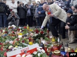 Польша халқы ел астанасындағы президент сарайының алдына келіп, дәл осы күні Ресейдің Смоленск облысында ұшақ апатында қаза тапқандарды жоқтауда. Варшава, 10 сәуір 2010 жыл.
