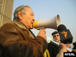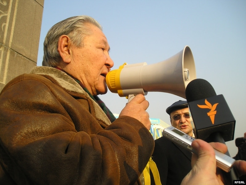 Қазақстан Компартиясының жетекшісі Серікболсын Әбділдин тәуелсіздік ескерткіші алдындағы жиында сөйлеп тұр. Алматы, 14 желтоқсан 2006 ж.