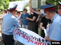 Наразылық акциясына шыққандардың қолындағы сөз бостандығына қысым жасамау туралы талап айтылған жазуларды полицейлер күштеп жұлып алып жатыр. Алматы, 24 маусым 2009 ж.