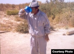Темірхан Момбекұлы Қорасан баба басындағы қасиетті судан ішіп тұр, Қызылорда облысы. Жеке мұрағаттағы сурет.