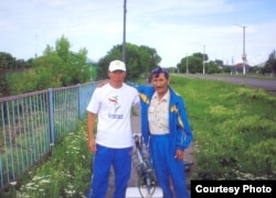 Темірхан Момбекұлы алыс қашықтыққа жүгіретін желаяқ Әскермен бірге. Пресновка ауылы, Жамбыл ауданы, Солтүстік Қазақстан облысы. Жеке мұрағаттағы сурет.