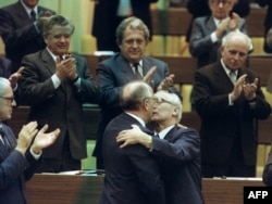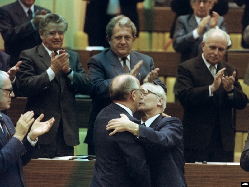 Совет Одағының басшысы Михаил Горбачев Германия демократиялық республикасы Компартиясының бас хатшысы Эрих Хонекермен құшақ айқастырып тұр. 17 сәуір 1986 жыл.