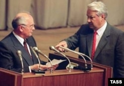 Борис Ельцин (оң жақта) Михаил Горбачевтан путчты қолдаған кісілердің аты-жөні жазылған тізімді оқып беруді талап етіп тұр. Мәскеу, тамыз, 1991 жыл.