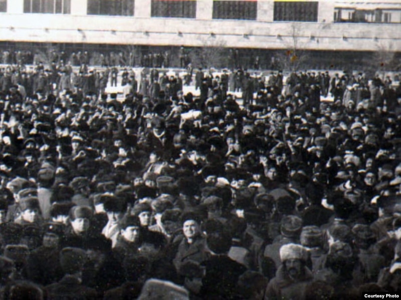 Мәскеудің шешіміне қарсы Алматының Брежнев атындағы (қазір Республика) алаңына наразылық шеруіне шыққан қазақ жастары. Желтоқсан, 1986 жыл. Сурет Алматының орталық мемлекеттік мұрағатынан алынды.