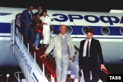 Фороста бірнеше күн үйқамақта болған Совет Одағының президенті Михаил Горбачевтің отбасымен Мәскеуге оралған сәті. 22 тамыз 1991 жыл.