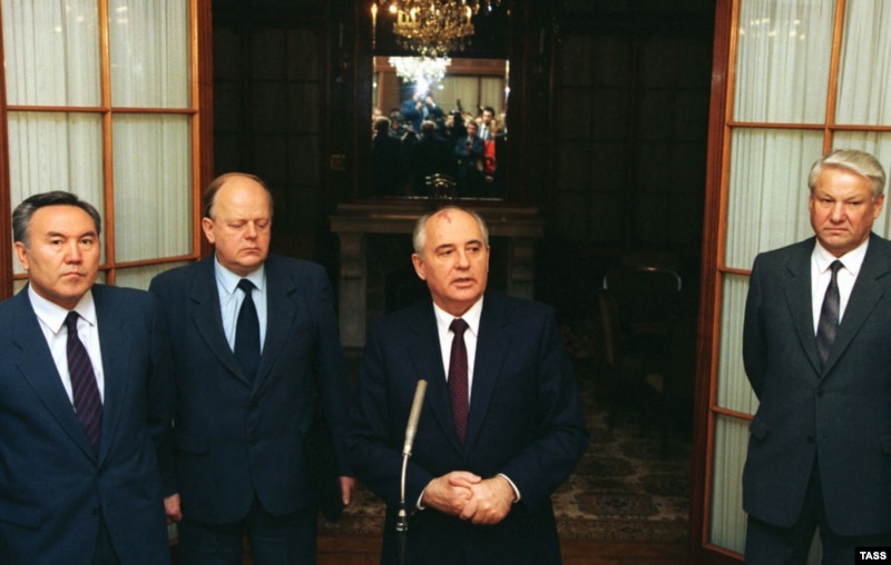Солдан оңға: Нұрсұлтан Назарбаев, Станислав Шушкевич, Михаил Горбачев, Борис Ельцин. Мәскеу, 14 қараша 1991 жыл. Бұл күні ССРО Мемлекеттік кеңесі егемен мемлекеттердің одағы туралы келісімнің жобасын қарап, оған бірқатар толықтырулар енгізген соң қол қою жөнінде ұйғарымға келген еді.