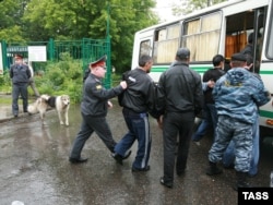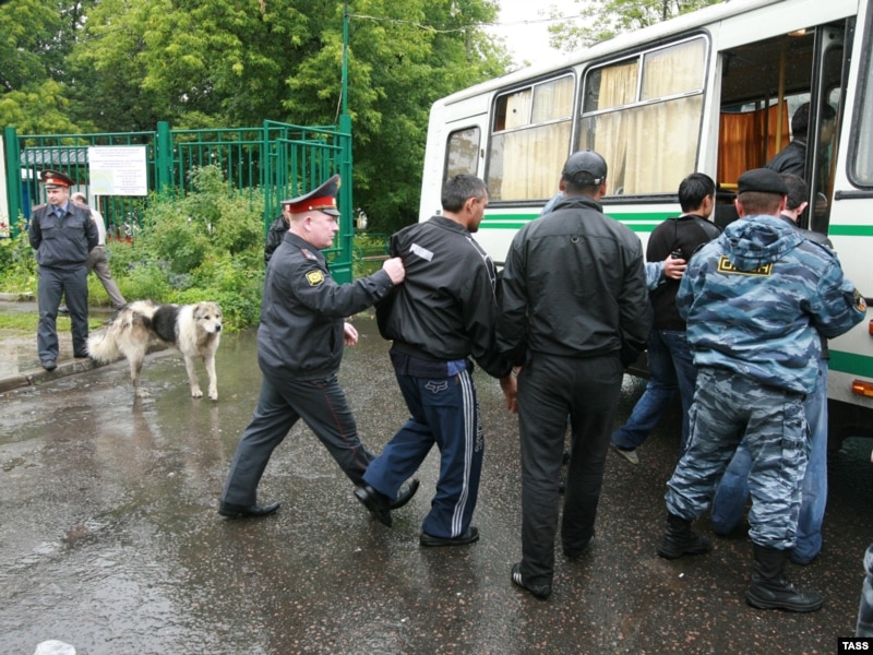 Милиционерлер Черкизов ауданында жұмыс істеген мигранттарды тұтқынға алып жатыр. Мәскеу, 19 шілде 2009 жыл