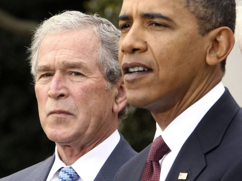 АҚШ-тың бұрынғы президенті Джордж Буш (сол жақта) және қазіргі президенті Барак Обама. Вашингтон, 16 қаңтар 2010 жыл.