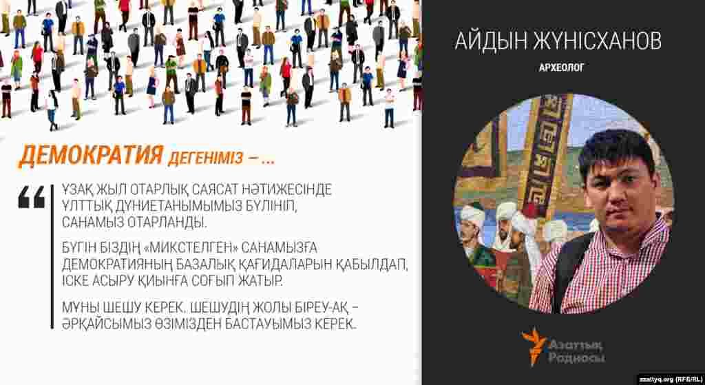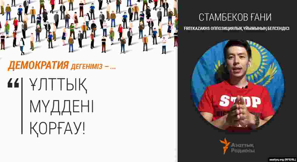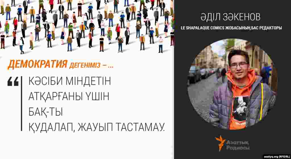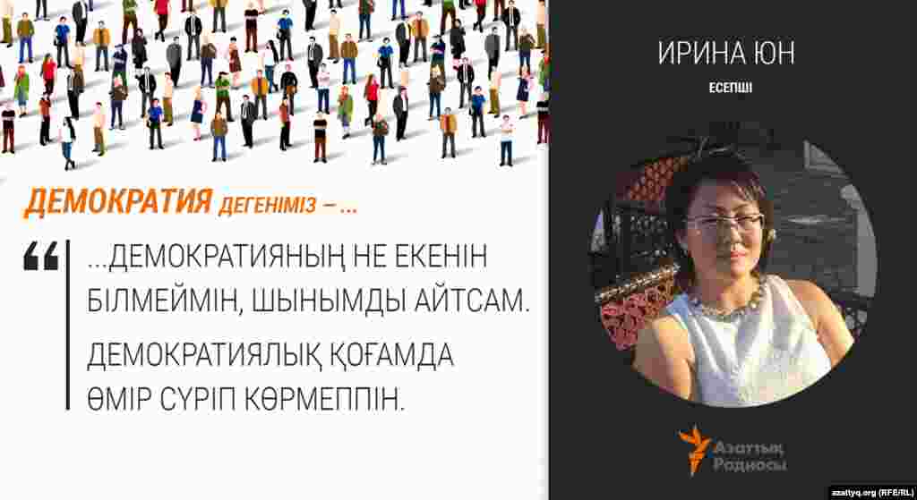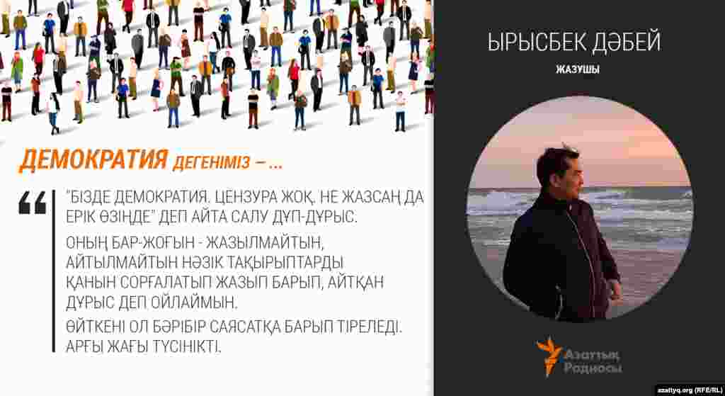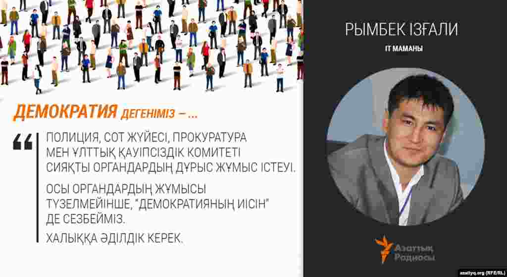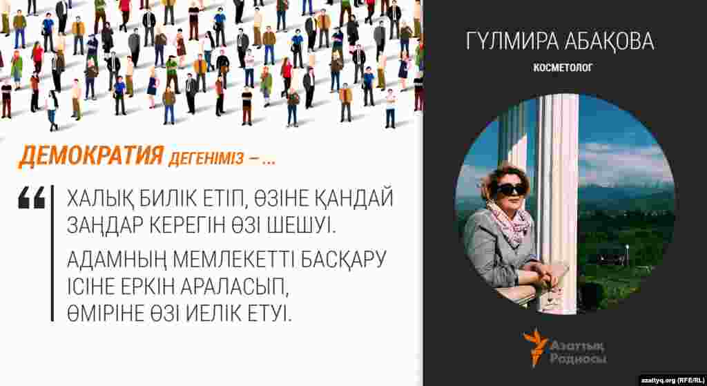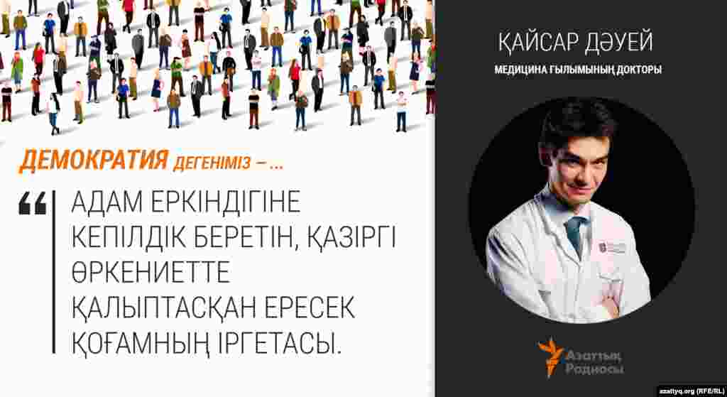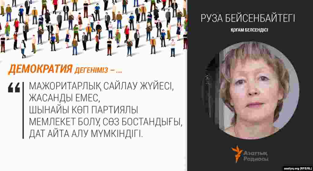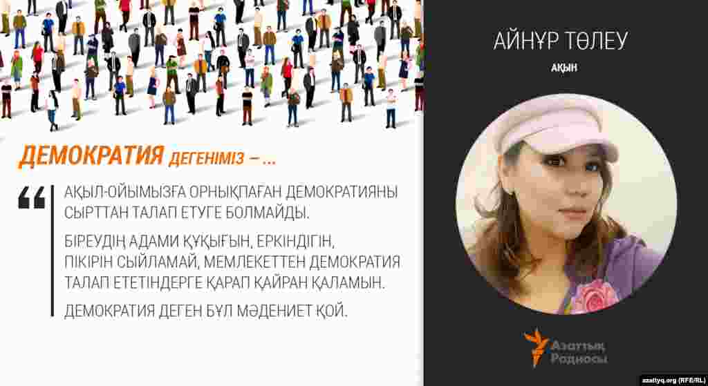 15 қыркүйек – халықаралық демократия күні. Конституцияда “Қазақстан - демократиялық мемлекет” деп жазылғанмен халықаралық ұйымдар Қазақстанды демократиясы дамыған ел ретінде санамайды. Біз әртүрлі әлеуметтік топ өкілдерінен “демократия” сөзінің мәнін сұрап көрдік. Ал сіз қалай ойлайсыз?