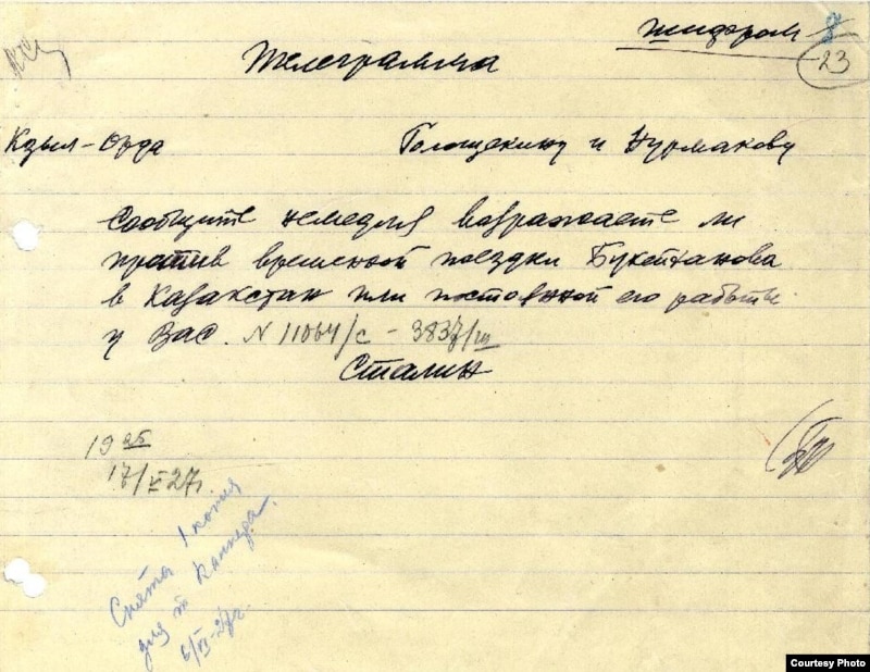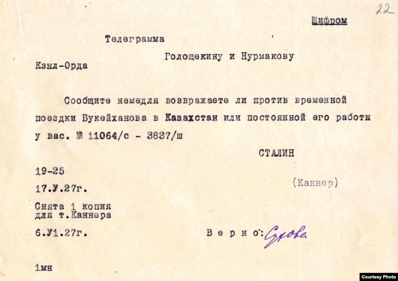 «Мәскеу РКИ ОК Сталинге. Ташкенттен. Қырреспубликасы басшыларының өкімімен 14 қазанда Қарқаралыда Әлихан Бөкейханов тұтқындалған. Алашордашыларға рақымшылық беру жөніндегі декретті, совет өкіметінің Қырғызияның жергілікті бұқара халқымен әлсіз байланысын, Қырғызия советтері соңғы съезінің жұмысының нәтижесінде пайда болған ахуалды қаперге ала отырып, сонымен бірге бұл хабардың халық расында дүрбелең туғызуы мүмкіндігін ескере отырып, егер оның тұтқындалуына негіз жоқ болса, Бөкейхановтың тез арада босатылуына Сіздің араласуыңызды сұраймыз. ТурЦИК төрағасының орынбасары Қожанов, Совнарком төрағасы Рысқұлов».