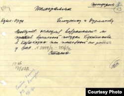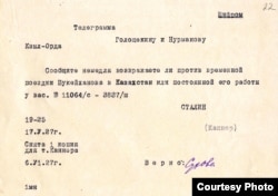 Әлихан Бөкейханның Қазақстанға баруына қалай қарайтынын сұрап Сталиннің Голощекин мен Нұрмақовқа жолдаған жеделхатының қолжазбасы.