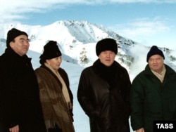 Солдан оңға: Асқар Ақаев, оның зайыбы Майрам, Нұрсұлтан Назарбаев және Ислам Каримов Шымбұлақтағы тау шаңғысы базасында. Алматы, 8 қаңтар 2001 жыл.