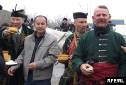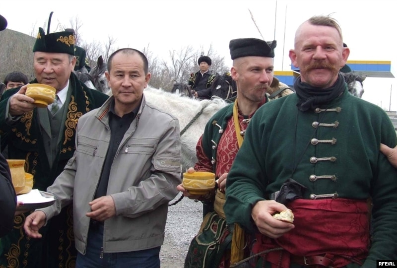 Түлкібас ауданында жергілікті жұрт қонақтардың алдынан бауырсақ пен қымыз алып шықты. мамыр, 2009 жыл.