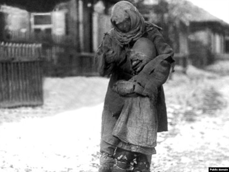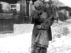 1930-жылдардағы аштыққа ұрынған қазақ әйелі мен баласы.