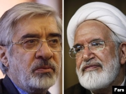 Оппозициялық Жасылдар қозғалысының жетекшілері Мир-Хосейн Мусави (сол жақта) мен Мехди Карруби. Тегеран.