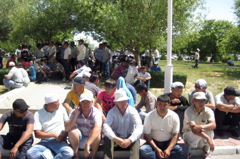 Маусымның 2-сі күні Маңғыстау облысы әкімдігі алдына жиналған Қаражанбас кеніші мұнайшыларының отбасы әкімнің көмегімен өздерінің