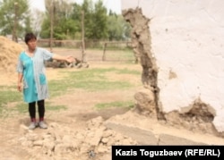 Гүлбаршын Иманбаева зілзаладан құлаған үйдің қабырғасын көрсетіп тұр. Қазатком ауылы. Алматы облысы. 6 мамыр 2011 жыл.