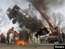 Бішкектің орталығынан өртенген жүк машинасын шығару. 9 сәуір, 2010 жыл.