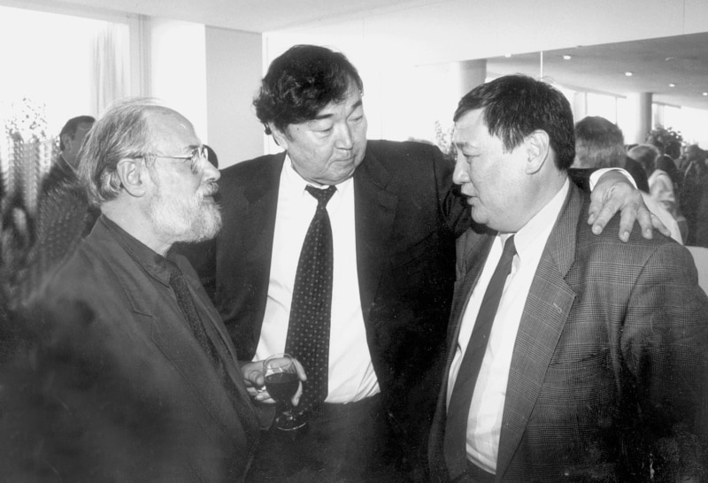 Олжас Сүлейменов (ортада) ақын Бақытжан Қанапиянов (оң жақта) және Сорбонна университетінің профессоры Леон Робельмен бірге. Париж, 1997 жыл. (Көрнекі сурет)