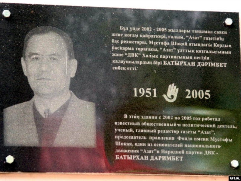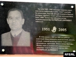 Алға партиясының ғимаратындағы Батырхан Дәрімбетке орнатылған ескерткіш тақта.Алматы, 7 маусым, 2010 жыл.