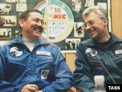 Талғат Мұсабаев (сол жақта), Қазақстан ғарыш агенттігінің төрағасы. Байқоңыр, 27 сәуір 2001 жыл