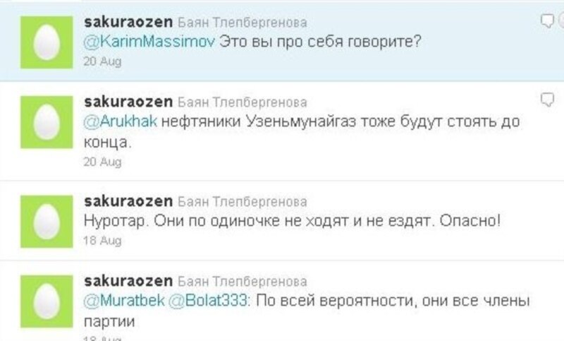 «@KarimMassimov ереуілдеген мұнайшыларды жұмыстан шығарғанша, дарынсыз шенеуніктерді қызметтен босатыңыздар. Келісімге жиналуды талам етеміз» деп жазды @zhanaozen (Роза Төлетаева) тамыздың 17-сі күні Қазақстан премьер-министрінің Twitter парағына.