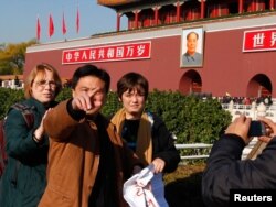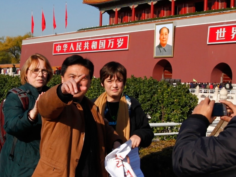 Жай киім киген Қытай полициясының қызметкері шетелдік адам құғығн қорғаушылардың Тяньаньмэнь алаңында суретке түсуіне кедергі келтіріп тұр. Бейжің, 22 қараша 2010 жыл